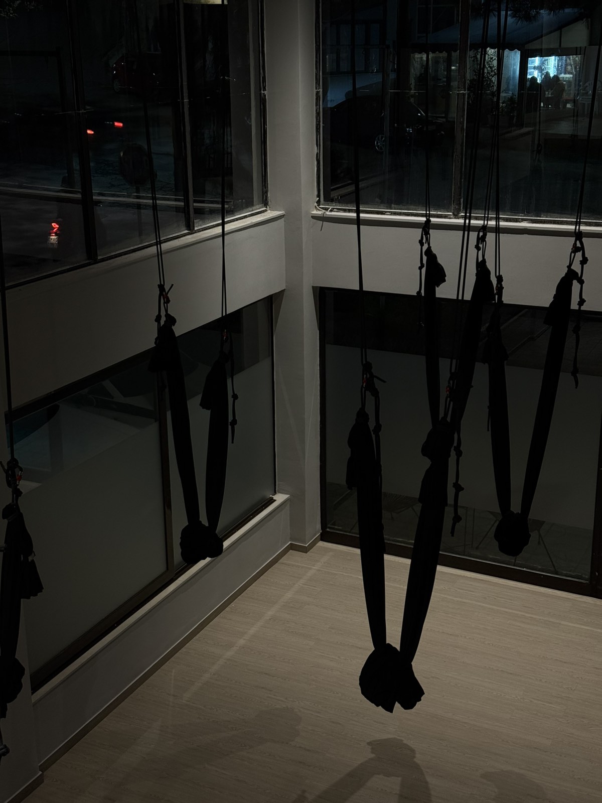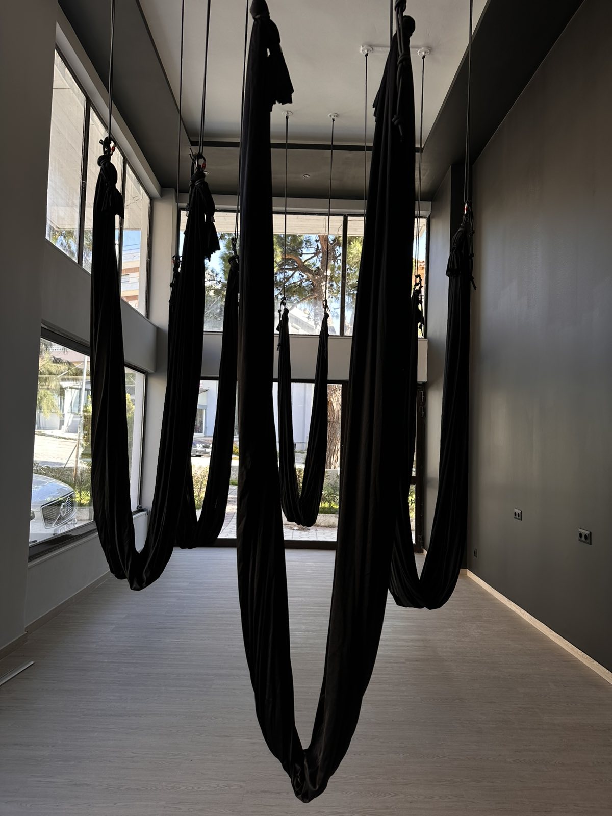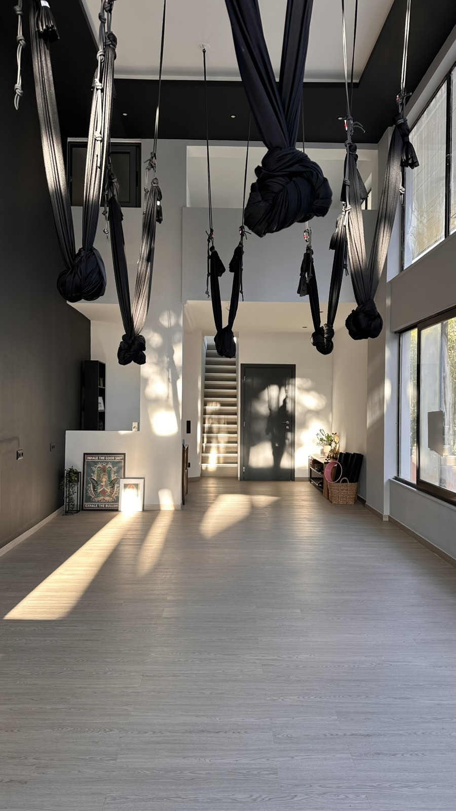 The studio accommodates yoga practices, aerial sessions with swings, and Pilates, providing a holistic wellness experience.